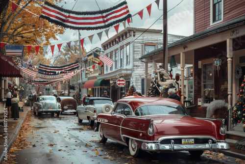 Vintage 1950s Main Street Celebration with Classic Cars and Festive Decorations