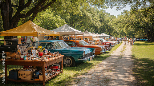 Visitors enjoying a sunny day at the outdoor classic car show and flea market, strolling along vintage cars