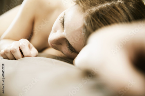 Akt, młoda kobieta, naga, leżąca na łóżku