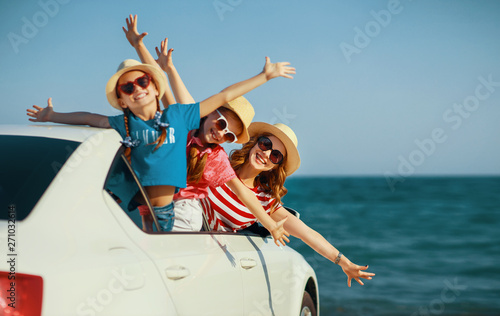 szczęśliwa rodzina matka i dzieci dziewczyny idą na letnią podróż samochodem.