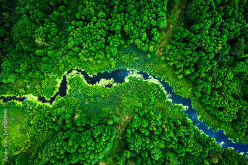Zadziwiające kwitnące glony na zielonej rzece, widok z lotu ptaka