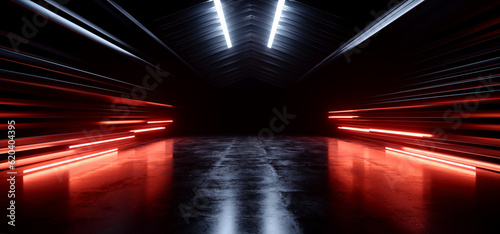 Futuristic Sci Fi Cyber Neon Laser White White Orange Lights Metal Stripe Glossy Barn Garage Studio Showroom Tunnel Corridor Underground Concrete Warehouse Room 3D Rendering