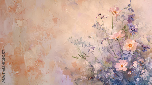 Subtelna akwarelowa kompozycja z delikatnymi różowymi i fioletowymi kwiatami na jasnym, pastelowym tle.