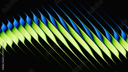 3d render, dynamic abstract geometric stripes in blue and green gradient on a black background