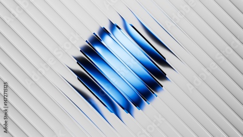 Ribbed glass effect. 3d rendered design featuring a sphere shape with blue and black gradient, set behind a white matt blinds