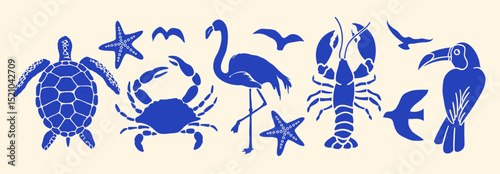 Tropical marine animal silhouette set in bold blue. Includes crab, turtle, flamingo, toucan, lobster, starfish, and birds. Perfect for beach, summer, and ocean-themed designs.