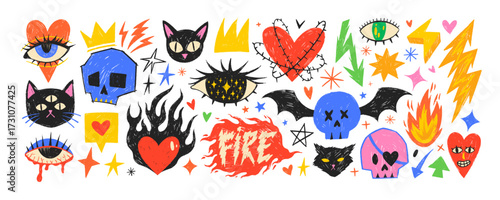 Punk cartoon doodle sticker collection with pencil rough texture. Hand drawn colorful vector tattoo illustrations. Funky black cats, rock'n'roll skulls, mystical eyes and various cute elements.