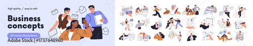 Business concepts, office work, professional icons set. Job success, communication, management, planning, developing strategy, corporate team. Flat vector illustration isolated on white background