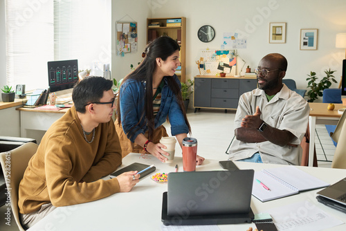 Diverse group of adults including Asian man, woman, Black man collaborating around table in modern office, in discussion with laptops and documents visible
