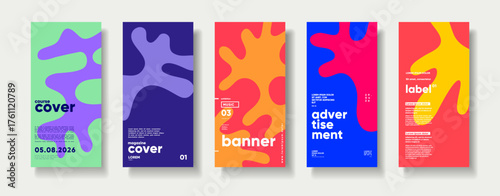 A vibrant collection of abstract poster designs featuring bold colors and organic shapes. Each poster showcases unique layouts suitable for courses, magazines, banners, advertisements, and labels.
