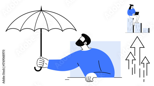 Man holding an umbrella as a protection metaphor, growth arrows symbolizing success, and a woman seated on bars working on a laptop. Ideal for business, safety, financial stability, support, growth