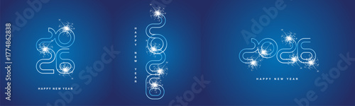 2026 Happy New Year event ultra modern neon line design numbers typography. Set collection of 2026 white blue icon logo with sparkle firework for calendar, poster, banner and social media template