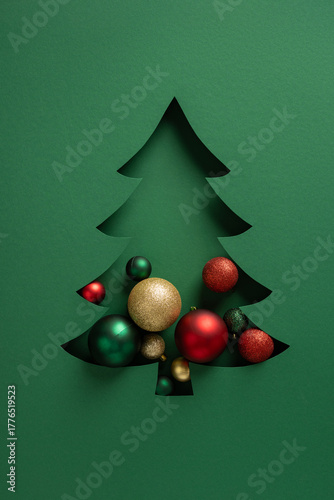 Green card features a tree silhouette cut from the page with shiny red gold and green balls, capturing Christmas and New Year spirit and holiday magic
