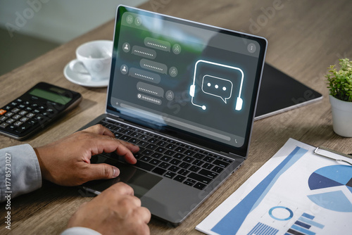 Businessman using AI chatbot interface on laptop for digital contact center support chatbot technology assisting