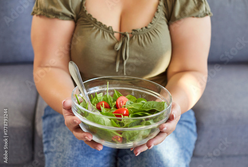 Fat woman eating healthy food. Cropped shot of chubby plump overweight girl sitting on couch holding glass bowl of fresh vegetable salad. Healthy diet and weight loss concept