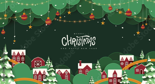 Christmas holiday village landscape background in paper cut style with snowy houses, pine trees, forest, decoration, star, ornament, hanging ball, snowfall, winter night, and greeting card banner