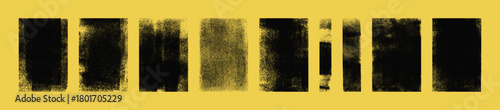 Set of grunge rolled ink stamp textures handmade with brayer. Letterpress vintage rough rectangle vertical backgrounds. Linocut relief printing shapes vector illustration isolated on yellow background