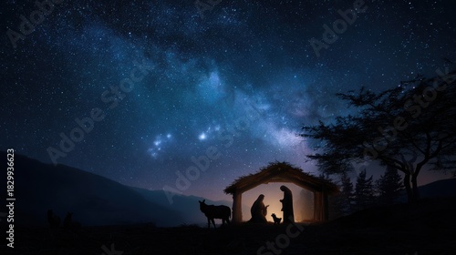 Nativity scene, Christian Christmas concept, Birth of Jesus Christ. Family with holy child in barn in dark blue night.