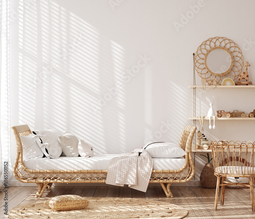 Poster frame mockup in beautiful nursery with rattan furniture, Scandi-Boho children room interior, 3d render