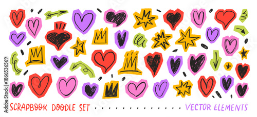 Colorful funky hearts, crown and star scrapbook stickers set. Crayon drawn scribble doodle collage elements. Vector scrapbook collage stickers for hand drawn journaling, dairy, notebooks.