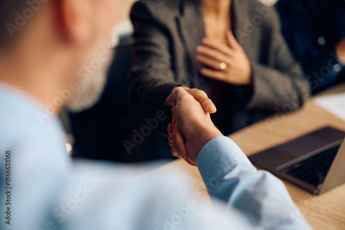 Close up of business people shaking hands on meeting in office.
