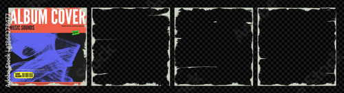 Distressed music cd cover overlay set with album cover design. Grunge scratch square frames with torn shrink texture. Set of vinyl or photo torn grange frames templates with colorful stickers.