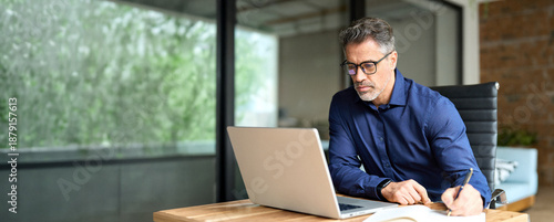 50 years old business man company manager investor working on computer technology sitting at office desk. Busy mature middle aged professional businessman executive using laptop at work writing notes.