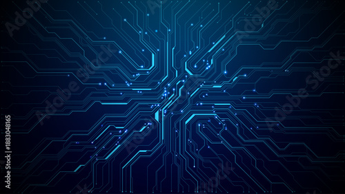 Abstract tech background featuring circuit patterns and blue chip design. Digital board texture with electronic lines for futuristic data concepts. Digital technology vector background.
