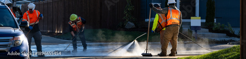 Specialized hazardous materials response team, hazmat cleanup of spilled chemicals on residential housing development job site, workmen with pressure sprayer and broom