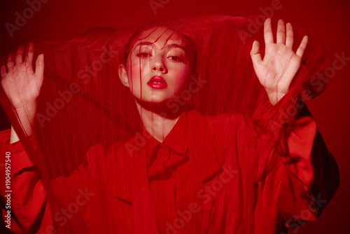 Fashionable young woman in red outfit behind red mesh fabric. Creative beauty concept with strong color contrast on a red background. Artistic high fashion studio shot.
