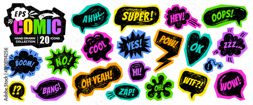 Comic bubble Pop collage sticker set. Boom, wow pow, bang text. Speech box with scrapbook cutout effect. Doodle comic pop icon. Y2k cartoon wow bomb boom collage. Vector onomatopoeia art. Talk balloon