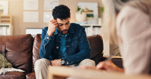 Clipboard, conversation and therapist with man in office with checklist for mental health evaluation. Coach, patient information and psychologist with person for support of stress, ptsd or anxiety.