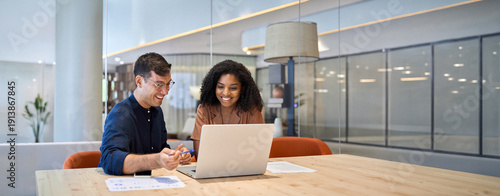 Smiling team professional employees working together on computer discussing online technology data solutions at work. Two young busy diverse coworkers business people using laptop at office meeting.
