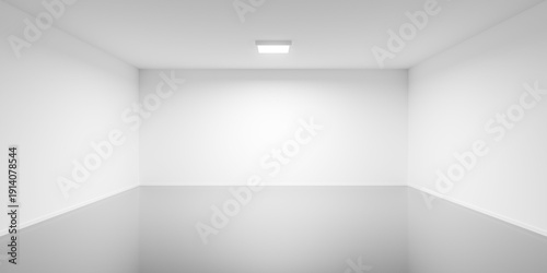 Empty blank white large room background with single square light and grey floor, modern interior template