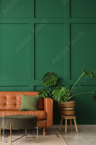 Interior of living room with brown sofa, pouf and palm plant