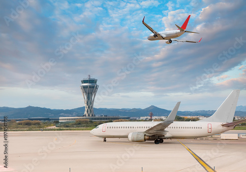 White Passenger plane fly up over take-off runway from airport - El Prat-Barcelona airport. This airport was inaugurated in 1963 - Barcelona, Spain