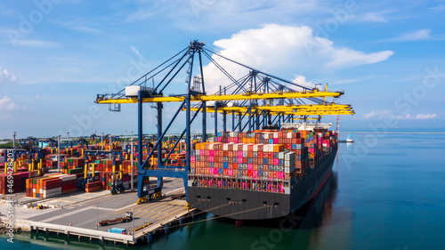 Industrial container logistics unloading import and export container terminal, Container ship carrying container with quay crane, Global business cargo freight shipping logistic by ship vessel.