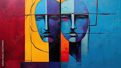 Rozdwojenie jaźni na kubistycznym kolorowym obrazie.