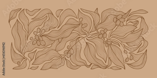 Vector coffee pattern background, line wavy illustration with beans. Floral, leaves print, package, banner. Art deco vintage style.