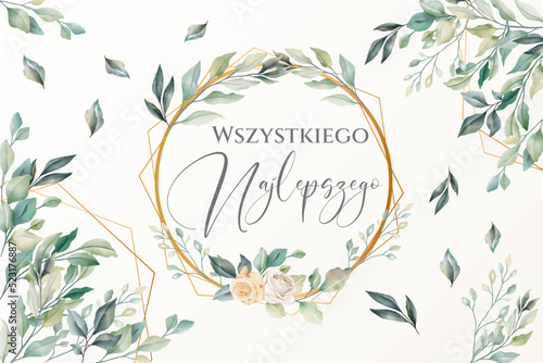 kartka lub baner z życzeniami wszystkiego najlepszego w kolorze zielonym w kółko i złotym diamentem z kwiatami i liśćmi na ecru tle z zielonymi gałązkami liści