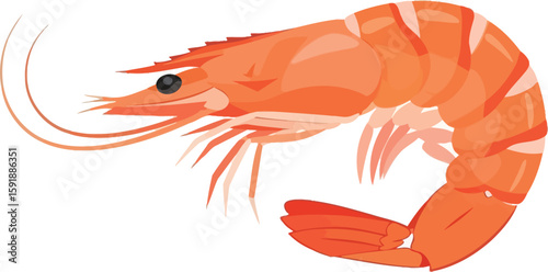Illustration of a cooked shrimp with curled body and long antennae on a white background