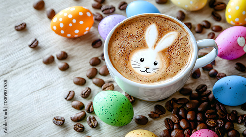 A cup of delicious coffee with a bunny on the surface on the coffee table around Easter eggs and coffee beans