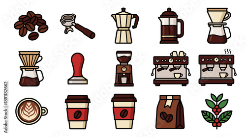 Comprehensive Coffee Icon Set with Espresso Machine, Moka Pot, French Press, Pour Over, Grinder, Tamper, Takeaway Cups, Latte Art, Coffee Beans, and Plant in a Bold Outline Flat Illustration Style.